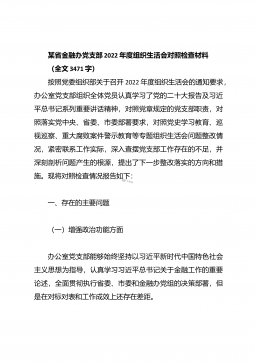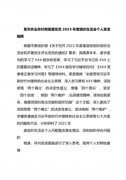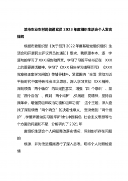 某市农业农村局普通党员2023年度组织生活会个人发言提纲根据市委组织部《关于召开2022年度基层党组织组织生活会和开展民主评议党员的通知》要求,我原原本本、逐字逐句的学习了XXX报告和党章,学习了习近平总书记在XXX上的重要讲话精神,学习了《XXX报告学习辅导百问》《XXX党章修正案学习问答》等辅导材料。紧紧围绕“全面贯彻习近平新时代中国特色社会主义思想,深入学习贯彻XXX精神,深刻领悟‘两个确立’的决定性意义,增强‘四个意识’、坚定‘四个自信’、做到‘两个维护’,弘扬建党精神,坚持自我革命,增强党组织政治功能和组织功能”这个主题,深入查找了深刻领悟“两个确立”的决定性意义、坚决做到“两个维护...