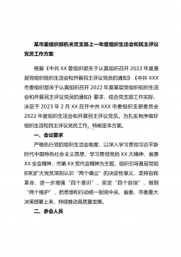 某市委组织部机关党支部上一年度组织生活会和民主评议党员工作方案根据《中共XX委组织部关于认真组织召开2022年度基层党组织组织生活会和开展民主评议党员的通知》《中共XXX市委组织部关于认真组织召开2022年度基层党组织组织生活会和开展民主评议党员的通知》要求,结合党支部工作实际,决定于2023年2月XX召开中共XXX市委组织支部委员会2022年度组织生活会和开展民主评议党员。为扎实有序做好组织生活和民主评议党员工作,特制定本方案。一、会议要求严格执行党的组织生活会制度,以深入学习贯彻习近平新时代中国特色社会主义思想,学习贯彻党的XX大精神、省委XX全会精神、市第XX党代会精神为主题,组织引导基...
