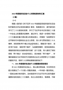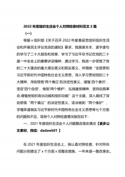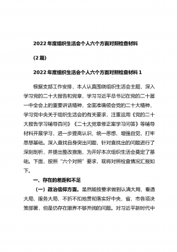 2022年度组织生活会个人对照检查材料范文2篇(一)根据x组织部《关于召开2022年度基层党组织组织生活会和开展民主评议党员的通知》要求,我原原本本、逐字逐句的学习了二十大报告和党章,学习了习近平总书记在党的二十届一中全会上的重要讲话精神,通过学习,我进一步领悟了党的二十大蕴含的重大理论意义和现实意义,并围绕“全面贯彻习近平新时代中国特色社会主义思想,深入学习贯彻党的二十大精神,深刻领悟'两个确立'的决定性意义,增强'四个意识'、坚定'四个自信'、做到'两个维护',弘扬建党精神,坚持自我革命,增强党组织政治功能和组...