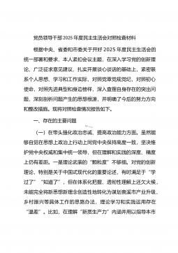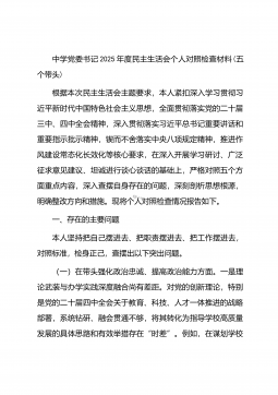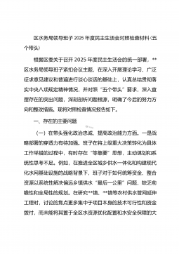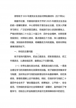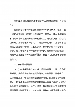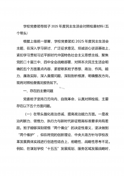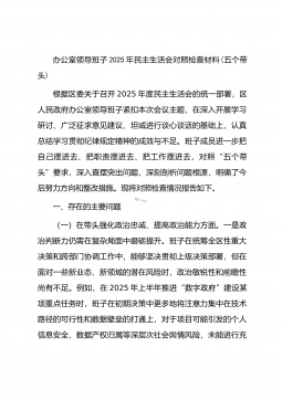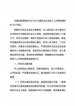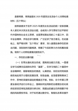 县委常委、常务副县长2025年度民主生活会个人对照检查材料(五个带头)按照县委关于召开2025年度民主生活会的统一安排部署,本人紧扣本次民主生活会主题,会前深入学习贯彻习近平新时代中国特色社会主义思想,全面贯彻落实党的二十届三中、四中全会精神,并结合学习教育,广泛征求了各方意见。在此基础上,我严格对照“五个带头”要求,深入查摆自身存在的突出问题,深刻剖析问题根源,明确了今后的努力方向和整改措施。现将个人对照检查情况报告如下。一、存在的主要问题(一)在带头强化政治忠诚、提高政治能力方面。一是理论学习成果向实践转化存在“温差”。在学习党的二十届四中全会精神时,能够做到及时跟进、认真领会,但在如何将...
