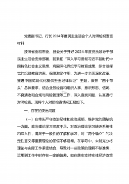 党委书记在司法厅党委理论学习中心组2025年第1次集体学习(扩大)会议暨2024年度民主生活会专题研讨会上的发言材料同志们:今天,我们召开自治区司法厅党委理论学习中心组2025年第1次集体学习(扩大)会议暨2024年度民主生活会专题研讨会,主要任务是深入学习领会习近平总书记在中共中央政治局民主生活会上的重要讲话精神,聚焦2024年度民主生活会主题,开展交流研讨,为高质量开好民主生活会打牢思想基础。一、深学细悟,准确把握习近平总书记重要讲话精神(一)深刻领会精神实质。习近平总书记在中共中央政治局民主生活会上的重要讲话,高屋建瓴、思想深邃,为全党同志特别是领导干部加强党性修养、坚定理想信念、提升政...