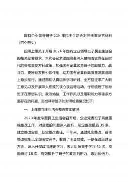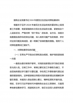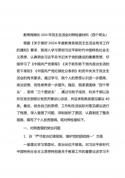 基层党组织书记2024年度专题民主生活会、组织生活会对照检查材料(四个带头+反面典型案例剖析)基层党组织书记2024年度专题民主生活会、组织生活会对照检查材料(四个带头+反面典型案例剖析)根据市委《关于召开2024年度民主生活会的通知》有关要求和局党组相关工作部署,我紧紧围绕本次民主生活会主题,深入学习习近平总书记重要讲话精神,认真研读党章党规党纪,,通过开展调查研究、深入谈心谈话等方式广泛收集各方意见建议,力求全面了解工作实际情况和群众诉求,结合思想和工作实际,围绕“四个带头”的具体要求,逐一查找差距,深入剖析问题根源。在此基础上,明确了努力方向,制定了整改措施。按照会议要求,现将个人对照检...
