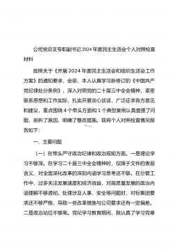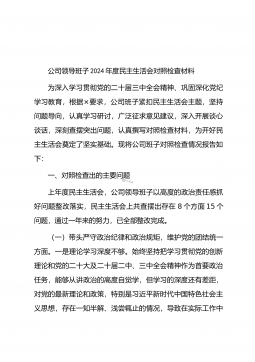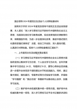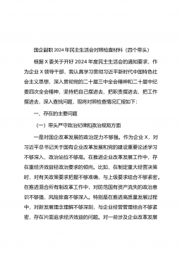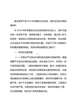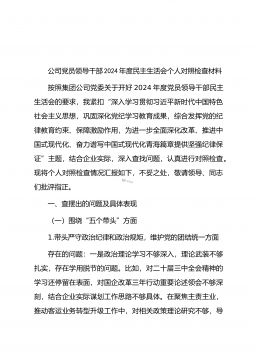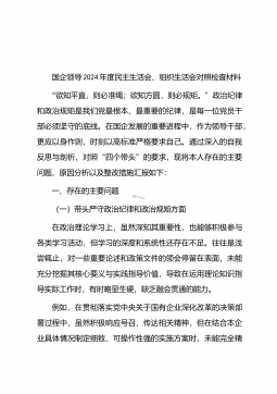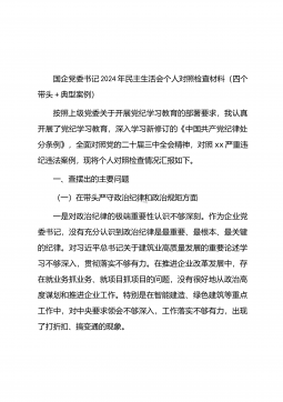 国企党委书记2024年民主生活会个人对照检查材料(四个带头+典型案例)按照上级党委关于开展党纪学习教育的部署要求,我认真开展了党纪学习教育,深入学习新修订的《中国共产党纪律处分条例》,全面对照党的二十届三中全会精神,对照xx严重违纪违法案例,现将个人对照检查情况汇报如下。一、查摆出的主要问题(一)在带头严守政治纪律和政治规矩方面一是对政治纪律的极端重要性认识不够深刻。作为企业党委书记,没有充分认识到政治纪律是最重要、最根本、最关键的纪律。对习近平总书记关于建筑业高质量发展的重要论述学习不够深入,贯彻落实不够有力。在推进企业改革发展中,存在就业务抓业务、就项目抓项目的问题,没有很好地从政治高度谋...