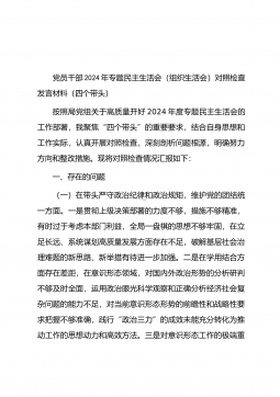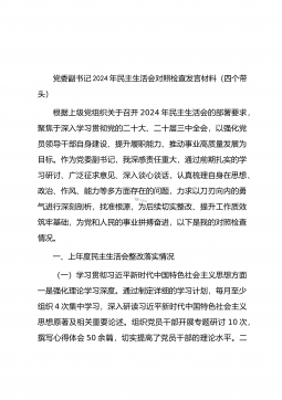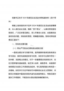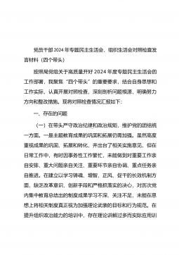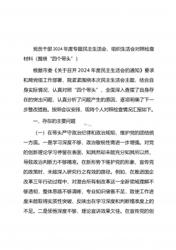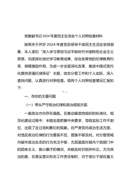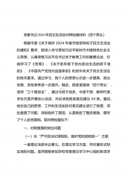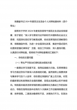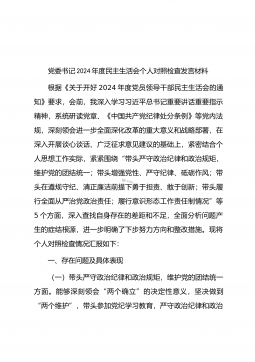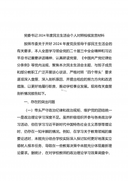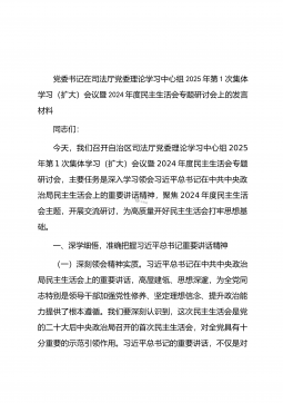 党委书记在司法厅党委理论学习中心组2025年第1次集体学习(扩大)会议暨2024年度民主生活会专题研讨会上的发言材料同志们:今天,我们召开自治区司法厅党委理论学习中心组2025年第1次集体学习(扩大)会议暨2024年度民主生活会专题研讨会,主要任务是深入学习领会习近平总书记在中共中央政治局民主生活会上的重要讲话精神,聚焦2024年度民主生活会主题,开展交流研讨,为高质量开好民主生活会打牢思想基础。一、深学细悟,准确把握习近平总书记重要讲话精神(一)深刻领会精神实质。习近平总书记在中共中央政治局民主生活会上的重要讲话,高屋建瓴、思想深邃,为全党同志特别是领导干部加强党性修养、坚定理想信念、提升政...
