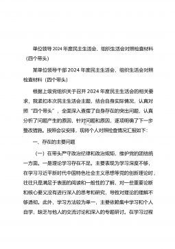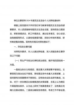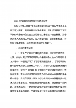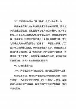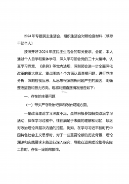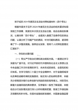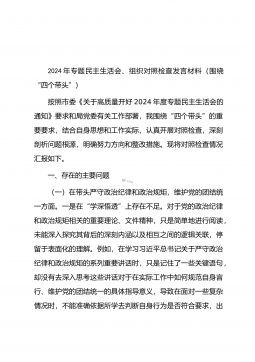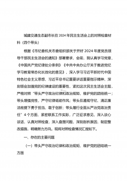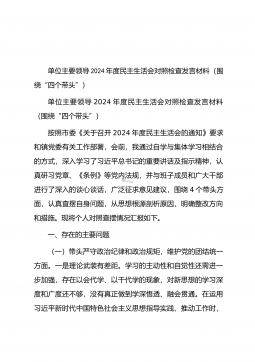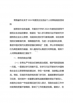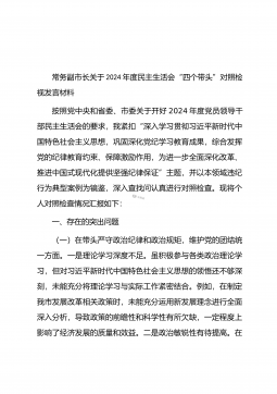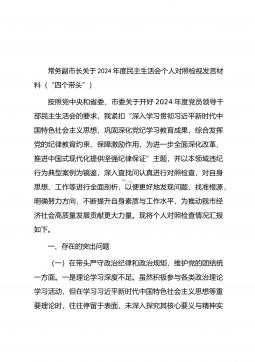常务副市长关于2024年度民主生活会个人对照检视发言材料(“四个带头”)按照党中央和省委、市委关于开好2024年度党员领导干部民主生活会的要求,我紧扣“深入学习贯彻习近平新时代中国特色社会主义思想,巩固深化党纪学习教育成果,综合发挥党的纪律教育约束、保障激励作用,为进一步全面深化改革、推进中国式现代化提供坚强纪律保证”主题,并以本领域违纪行为典型案例为镜鉴,深入查找问认真进行对照检查,对自身思想、工作等进行全面剖析,以便更好地发现问题、找准根源,明确努力方向,不断提升自身素质与工作水平,为推动我市经济社会高质量发展贡献更大力量。现将个人对照检查情况汇报如下。一、存在的突出问题(一)在带头严守政...
