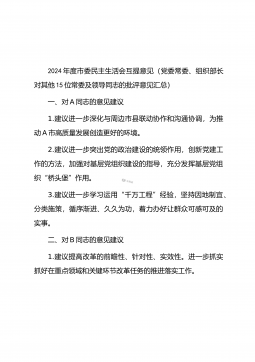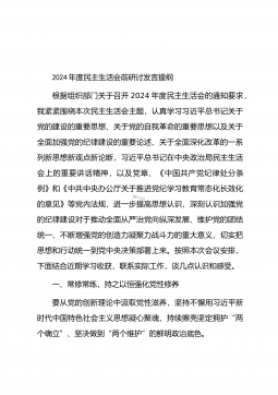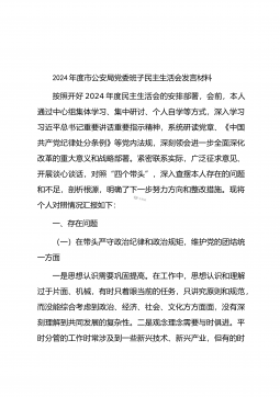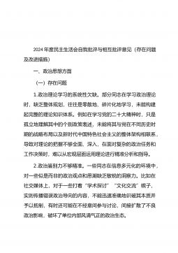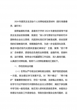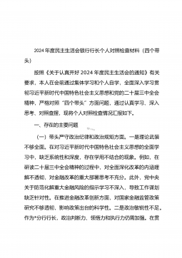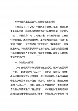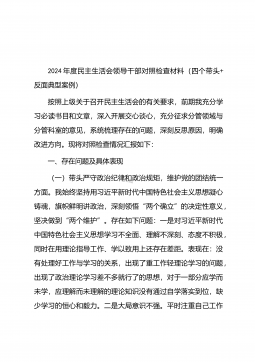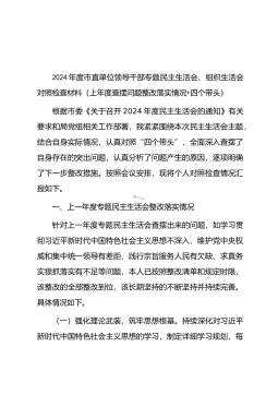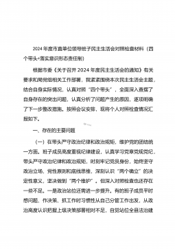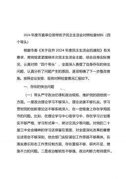 2024年度市直单位领导干部专题民主生活会、组织生活会对照检查材料(上年度查摆问题整改落实情况+四个带头)根据市委《关于召开2024年度民主生活会的通知》有关要求和局党组相关工作部署,我紧紧围绕本次民主生活会主题,结合自身实际情况,认真对照“四个带头”,全面深入查摆了自身存在的突出问题,认真分析了问题产生的原因,逐项明确了下一步整改措施。按照会议安排,现将个人对照检查情况汇报如下。一、上一年度专题民主生活会整改落实情况针对上一年度专题民主生活会查摆出来的问题,如学习贯彻习近平新时代中国特色社会主义思想不深入、维护党中央权威和集中统一领导有差距、践行宗旨服务人民有欠缺、求真务实狠抓落实有不足等问...