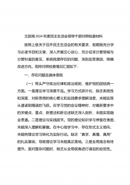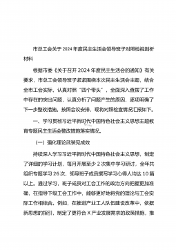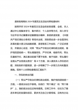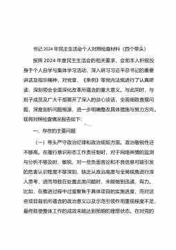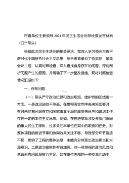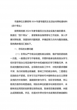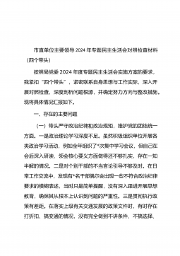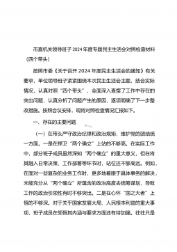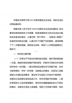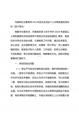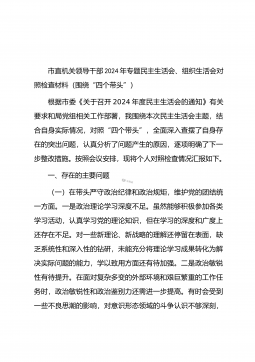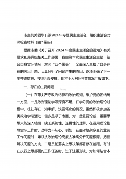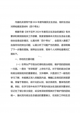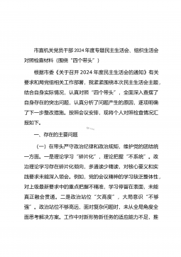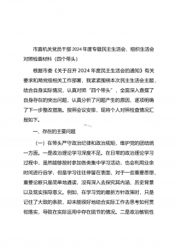 市直机关党员干部2024年度专题民主生活会、组织生活会对照检查材料(围绕“四个带头”)根据市委《关于召开2024年度民主生活会的通知》有关要求和局党组相关工作部署,我紧紧围绕本次民主生活会主题,结合自身实际情况,认真对照“四个带头”,全面深入查摆了自身存在的突出问题,认真分析了问题产生的原因,逐项明确了下一步整改措施。按照会议安排,现将个人对照检查情况汇报如下。一、存在的主要问题(一)在带头严守政治纪律和政治规矩,维护党的团结统一方面。一是理论学习“碎片化”,理论把握“不系统”。政治理论学习存在碎片化倾向,多通读少精读,对核心要义和实践要求未能深入领会。例如,党的会议精神的学习缺乏整体性,对上...