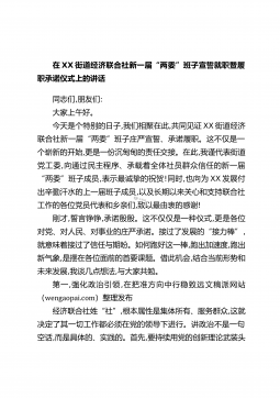 在XX街道经济联合社新一届“两委”班子宣誓就职暨履职承诺仪式上的讲话同志们,朋友们:大家上午好。今天是个特别的日子,我们相聚在此,共同见证XX街道经济联合社新一届“两委”班子庄严宣誓、承诺履职。这不仅是一个崭新的开始,更是一份沉甸甸的责任交接。在此,我谨代表街道党工委,向通过民主程序、承载着全体社员群众信任的新一届“两委”班子成员,表示最诚挚的祝贺!同时,也向为XX发展付出辛勤汗水的上一届班子成员,以及长期以来关心和支持联合社工作的各位党员代表和乡亲们,致以最由衷的感谢!刚才,誓言铮铮,承诺殷殷。这不仅仅是一种仪式,更是各位对党、对人民、对事业的庄严承诺。接过了发展的“接力棒”,就意味着接过了...