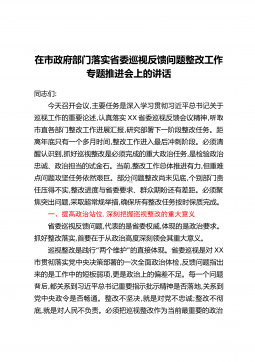 在市政府部门落实省委巡视反馈问题整改工作专题推进会上的讲话同志们:今天召开会议,主要任务是深入学习贯彻习近平总书记关于巡视工作的重要论述,认真落实XX省委巡视反馈会议精神,听取市直各部门整改工作进展汇报,研究部署下一阶段整改任务。距离年底只有一个多月时间,整改工作进入最后冲刺阶段。必须清醒认识到,抓好巡视整改是必须完成的重大政治任务,是检验政治忠诚、政治担当的试金石。当前,整改工作总体推进有力,但重难点问题攻坚任务依然艰巨。部分问题整改尚未见底,个别部门责任压得不实,整改进度与省委要求、群众期盼还有差距。必须聚焦突出问题,采取超常规举措,确保所有整改任务按时保质完成。一、提高政治站位,深刻把握...