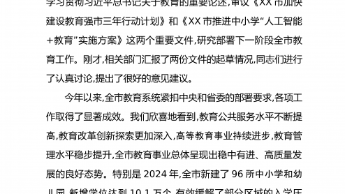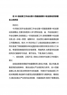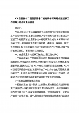 XX县委在十二届县委第十二轮巡察书记专题会暨巡察工作领导小组会议上的讲话同志们:今天,我们召开十二届县委第十二轮巡察书记专题会暨巡察工作领导小组会议,主要任务是深入学习贯彻习近平总书记关于巡视工作的重要论述,全面总结本轮巡察工作成效,分析研判当前形势,对下一阶段巡察工作进行再部署、再推动、再落实。刚才,各巡察组汇报了巡察情况,领导小组各位同志作了发言,提出了很好的意见建议。下面,我讲三点意见。一、充分肯定本轮巡察工作成效,坚定信心决心十二届县委第十二轮巡察启动以来,各巡察组坚决贯彻县委部署要求,坚守政治巡察定位,坚持问题导向,发扬斗争精神,扎实履职尽责,圆满完成了对XX个单位党组织的常规巡察和...