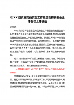 在XX县食品药品安全工作暨县食药安委会全体会议上的讲话同志们:今天,我们召开全县食品药品安全工作暨县食药安委会全体会议,主要任务是深入学习贯彻市级相关会议精神,总结分析当前我县食品药品安全工作面临的新形势、新挑战,并对下一阶段的重点工作进行全面安排和部署。食品药品安全,一头连着千家万户,一头连着经济发展和社会稳定,是关系人民群众身体健康和生“”命安全的国之大者,也是最基本的民生问题。我们必须认识到,“”这项工作没有完成时,“”只有进行时,容不得丝毫麻痹和懈怠。刚才,X同志对前一阶段的工作进行了回顾,指出了存在的问题,并就下一步具体工作提出了明确要求,我都同意,希望大家认真领会,抓好落实。下面,...