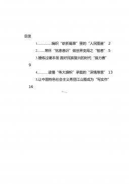 目录1................编织“崭新篇章”里的“人民图鉴”22........常怀“忧患意识”做世界变局之“智者”53.锤炼过硬本领跑好民族复兴的时代“接力赛”94............读懂“伟大旗帜”承载的“深情厚意”135.让中国特色社会主义秀丽江山图成为“写实作”16编织“崭新篇章”里的“人民图鉴”2022-7-28省部级主要领导干部“学习习近平总书记重要讲话精神,迎接党的二十大”专题研讨班7月26日至27日在京举行。习近平总书记指出,前进道路上,全党要坚持全心全意为人民服务的根本宗旨,树牢群众观点,贯彻群众路线,尊重人民首创精神,坚持一切为了人民、一切依靠人民,从群众中来...