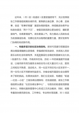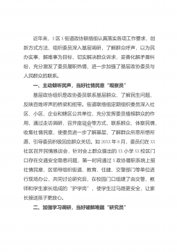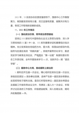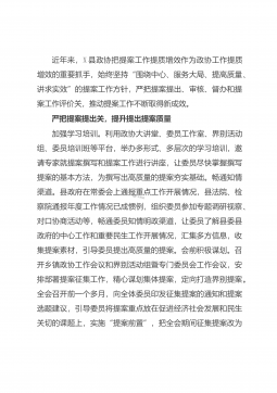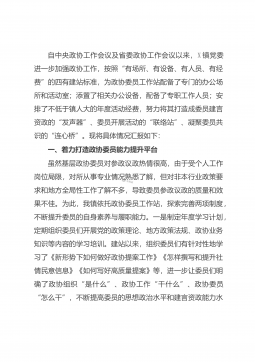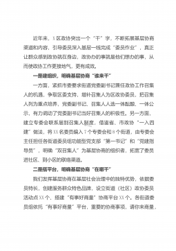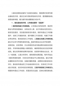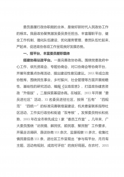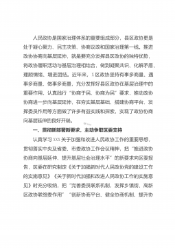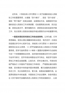 去年以来,我们深入学习贯彻习近平总书记重要讲话以及中央和省委、市委政协工作会议精神,牢牢把握政协性质定位,把协商议政作为主要工作,把双向发力作为工作主旨,完善机制、创新形式,努力做到资政建言有用、凝聚共识有效。一、“强链+补链”延伸协商深度我们把专题议政性常委会议作为“重头戏”,在协商链条的关键节点深耕细作,优化流程设计,增强协商成效。(一)专题片导入。坚持问题导向,把制作专题片作协商链条的首要环节重点打造,通过生动直观的形式,全方位展示工作成效、引出困难问题,达到先声夺人的目的。在今年X月召开的“大力发展数字经济”资政会上,首次播放了10分钟的“迈向经济发展新蓝海”专题片,既客观总结发展成绩...