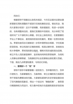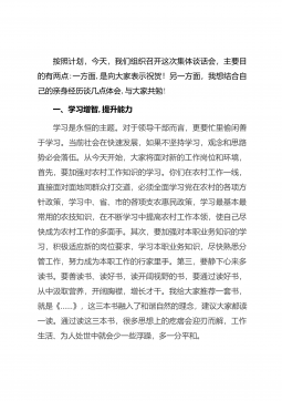 按照计划,今天,我们组织召开这次集体谈话会,主要目的有两点:一方面,是向大家表示祝贺!另一方面,我想结合自己的亲身经历谈几点体会,与大家共勉!一、学习增智,提升能力学习是永恒的主题。对于领导干部而言,更要忙里偷闲善于学习。当前社会在快速发展,如果不坚持学习,观念和思路势必会落伍。从今天开始,大家将面对新的工作岗位和环境,首先,要加强对农村工作知识的学习。你们在农村工作一线,直接面对面地同群众打交道,必须全面学习党在农村的各项方针政策,学习中、省、市的各项支农惠民政策,学习最基本最常用的农技知识,在不断学习中提高农村工作本领,使自己尽快成为农村工作的多面手。其次,要加强对本职业务知识的学习,积极...