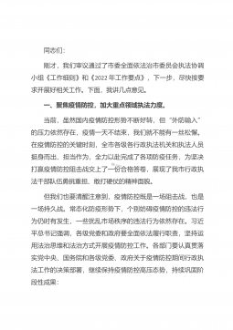 同志们:刚才,我们审议通过了市委全面依法治市委员会执法协调小组《工作细则》和《2022年工作要点》,下一步,尽快按要求开展好相关工作。下面,我讲几点意见。一、聚焦疫情防控,加大重点领域执法力度。当前,虽然国内疫情防控形势不断好转,但“外防输入”的压力依然存在,疫情一天不结束,我们就不能有一丝松懈。在疫情防控的关键时刻,全市各级各行政执法机关和执法人员挺身而出、担当作为,全力以赴完成了各项防疫任务,为坚决打赢疫情防控阻击战交上了一份合格答卷,展现了我市行政执法干部队伍勇挑重担、敢打硬仗的精神面貌。但我们也要清醒注意到,疫情防控既是一场阻击战,也是一场持久战。常态化防疫形势下,个别妨碍疫情防控的违...