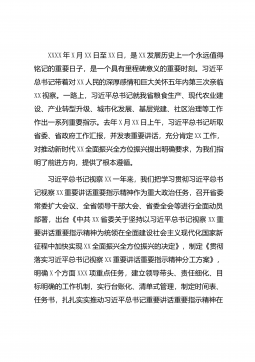 XXXX年X月XX日至XX日,是XX发展历史上一个永远值得铭记的重要日子,是一个具有里程碑意义的重要时刻。习近平总书记带着对XX人民的深厚感情和巨大关怀五年内第三次亲临XX视察。一路上,习近平总书记就我省粮食生产、现代农业建设、产业转型升级、城市化发展、基层党建、社区治理等工作作出一系列重要指示。去年X月XX日上午,习近平总书记听取省委、省政府工作汇报,并发表重要讲话,充分肯定XX工作,对推动新时代XX全面振兴全方位振兴提出明确要求,为我们指明了前进方向,提供了根本遵循。习近平总书记视察XX一年来,我们把学习贯彻习近平总书记视察XX重要讲话重要指示精神作为重大政治任务,召开省委常委扩大会议、全...