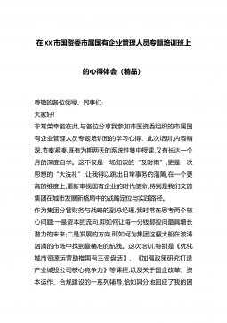 在XX市国资委市属国有企业管理人员专题培训班上的心得体会(精品)尊敬的各位领导、同事们:大家好!非常荣幸能在此,与各位分享我参加市国资委组织的市属国有企业管理人员专题培训班的学习心得。此次培训,内容精深,节奏紧凑,既有为期两天的系统性集中授课,又有长达一个月的深度自学。这不仅是一场知识的“及时雨”,更是一次思想的“大洗礼”,让我得以跳出日常事务的藩篱,在一个更高的维度上,重新审视国有企业的时代使命,特别是我们文旅集团在城市发展新格局中的战略定位与实践路径。作为集团分管财务与战略的副总经理,我时常在思考两个核心问题:一是资本的流向,即如何让每一分钱都投向最具增长潜力的未来;二是发展的方向,即如何...