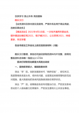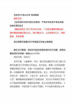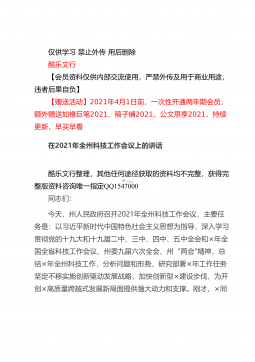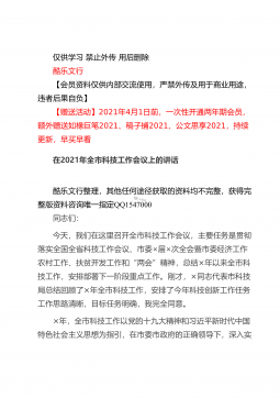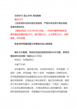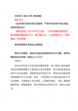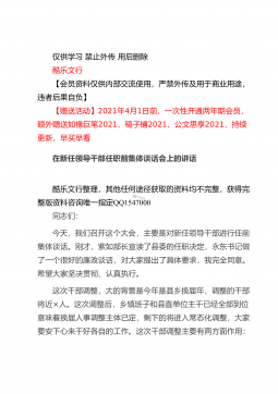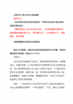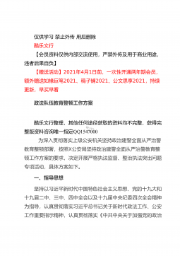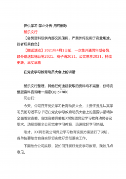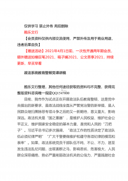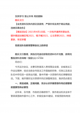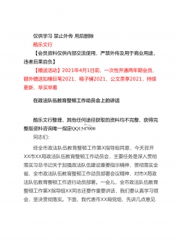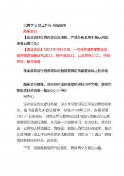 仅供学习禁止外传用后删除酷乐文行【会员资料仅供内部交流使用,严禁外传及用于商业用途,违者后果自负】【赠送活动】2021年4月1日前,一次性开通两年期会员,额外赠送如椽巨笔2021、稿子铺2021、公文思享2021,持续更新,早买早看在全县司法行政系统队伍教育整顿动员部署会议上的讲话酷乐文行整理,其他任何途径获取的资料均不完整,获得完整版资料咨询唯一指定QQ1547000同志们:这次会议的主要任务是:深入学习贯彻习近平法治思想和中央、省市县委有关会议精神,总结2020年工作,安排部署2021年任务措施,对党史学习教育和全县司法行政系统队伍教育整顿活动进行动员,从而进一步凝聚共识,全力以赴,努力打...