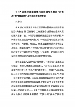 在XX“区医保基金管理突出问题专项整治突击”“”战暨百日行动工作推进会上的讲话同志们:今天,我们在这里召开全区医保基金管理突出问题专项“”“”整治突击战暨百日行动工作推进会,主要任务是深入贯彻落实国家、省、市关于加强医保基金监管的决策部署,分析当前我区面临的严峻形势,对下一阶段的专项整治工作进行再动员、再部署、再压实。刚才,区医保局的同志传达了上级部门的最新精神,“”“”并对我区突击战暨百日行动的实施方案作了详细解读,任务明确、分工清晰、要求具体,我完全同意,希望大家认真领会,坚决抓好贯彻落实。“”“”医保基金是人民群众的看病钱、救命钱,是维系社会稳定、保障人民健康的重要基石。守护好这笔基金,...